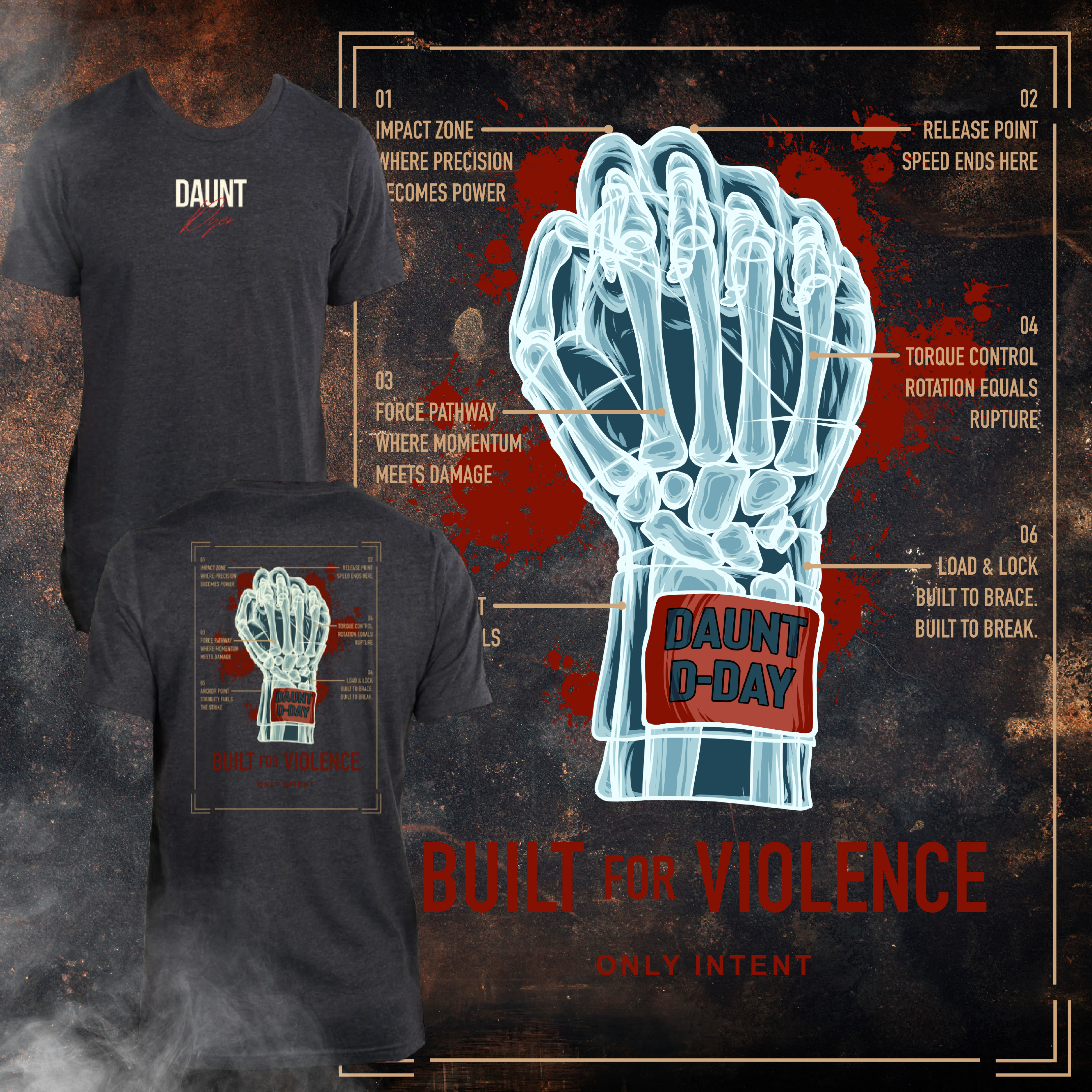 Precision isn’t an accident — it’s engineered. The “Built for Violence” tee is a striking breakdown of devastation, capturing the science behind Josh “D-Day” Dyer’s knockout intent. With a full anatomical-style back print over blood-spattered schematics and a clean DAUNT signature front, this design is a study in controlled destruction.