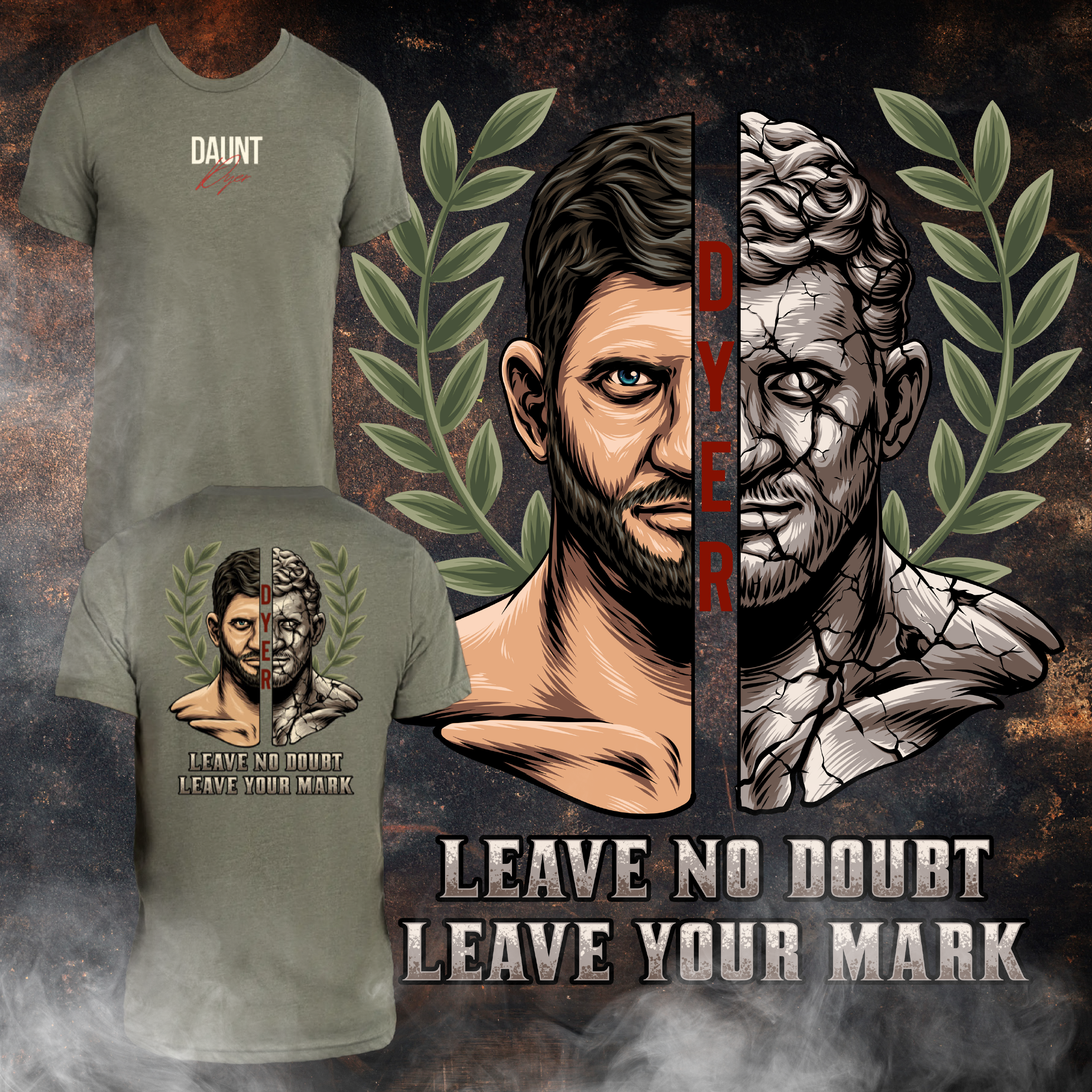 Legacy isn’t just lived, it’s carved in time. The “Leave No Doubt” tee embodies that truth, splitting between flesh and stone to represent a man becoming a monument. Half human, half statue. This design symbolizes the transformation of relentless effort into something eternal. It’s a tribute to the mindset that doesn’t just fight for today, but leaves a mark that outlasts it.
